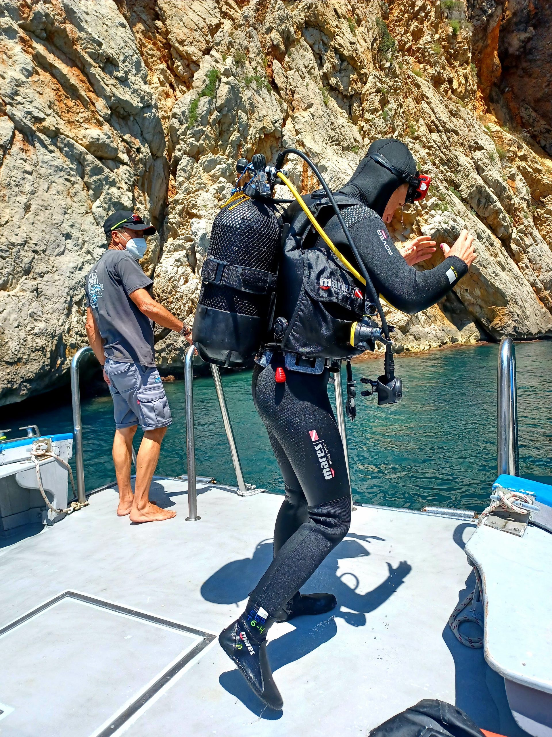 This trip took me to Palamós, on the Costa Brava. We arrived at the dive centre, got fitted for wetsuits, rented our gear, and boarded the boat. There’s always a touch of nervousness. Diving isn’t something I do every day, and a refresher is always helpful. Safety is paramount. Once I reviewed key details with my dive buddy and stepped onto the boat, I felt fully ready. With wetsuit on and gear checked, it was time to enter the water and see what awaited me below.